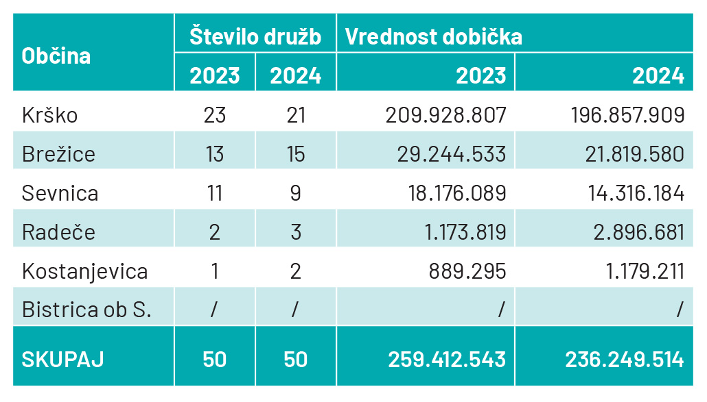 Kot običajno je med najuspešnejšimi v regiji največ podjetij iz mestne občine Krško in ustvarijo tudi daleč največ dobička, a je ta 'tekma' zaradi sedežev večine energetskih družb v krški občini nekoliko 'nepravična'. A tudi, če dobiček teh družb odštejemo, ga je Krško še vedno ustvarilo največ (slabih 28 mio evrov). Ob padcu skupnega dobička v 'klubu TOP 50' v največjih treh posavskih občinah je opazno zvišanje zlasti v radeški, pa tudi v kostanjeviški občini, medtem ko bistriška znova nima predstavnika v tej druščini.
