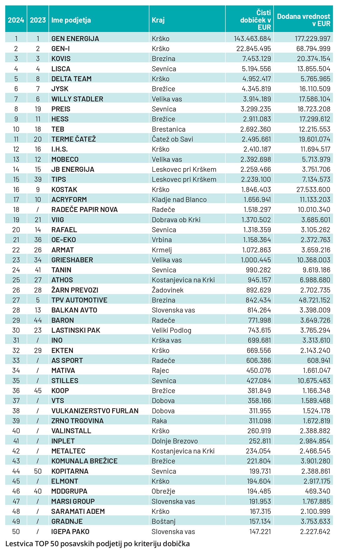 Dejan Paravan je na nedavni novinarski konferenci v Ljubljani poudaril, da so poslovno leto 2024 v Skupini GEN zaključili z odličnimi rezultati. Skupina je dosegla 2,2 milijarde evrov prihodkov, 186 milijonov evrov čistega dobička in 276 tisoč evrov dodane vrednosti na zaposlenega, kar presega načrtovane letne finančne cilje. Uspešno poslovanje je posledica stabilnega obratovanja proizvodnih objektov, dobrega obvladovanja stroškov proizvodnje, ugodne hidrologije, uspešnega upravljanja portfelja in upravljanja tveganj. Izpostavil je: »V zahtevnem letu 2024, ki so ga zaznamovali negotovosti na energetskih trgih, zahtevni regulativni okviri ter podnebni in geopolitični izzivi, smo v Skupini GEN zasledovali svoje cilje ter ostali zanesljiv in odgovoren partner v energetski preobrazbi. Vse naše proizvodne enote so delovale varno, stabilno in brez večjih prekinitev, kar je odraz dolgoletnih vlaganj v znanje, tehnologijo in vzdrževanje. Pomembno vlogo Skupine GEN v energetski preskrbi Slovenije potrjuje dejstvo, da smo tudi v letu 2024 slovenskim odjemalcem zanesljivo dobavljali izključno nizkoogljično električno energijo po sprejemljivih in predvidljivih cenah.« Največjo trojico posavskih podjetij tradicionalno dopolnjuje