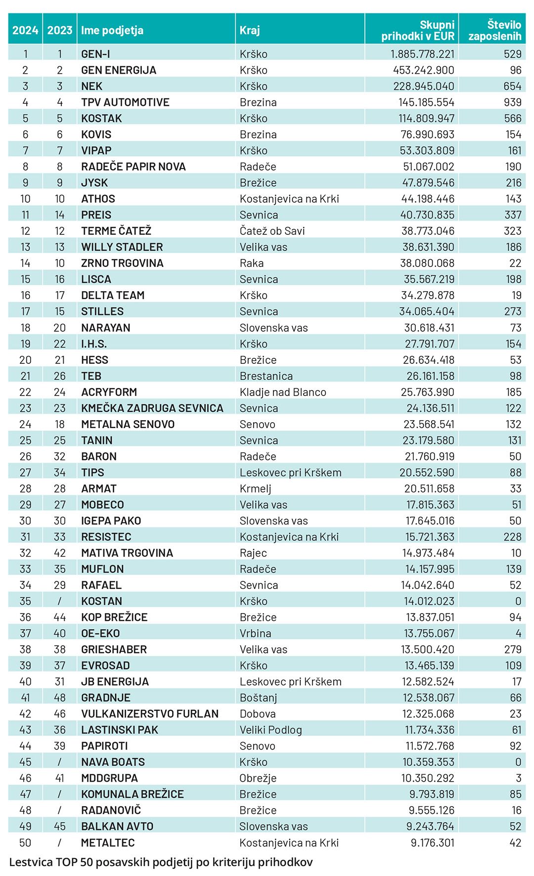 Posavskih TOP 50 je imelo lani 3,9 milijarde evrov prihodkov oz. skoraj 80 % regijskih prihodkov, nudili pa so 7.594 zaposlitev oz. več kot polovico vseh v regiji.