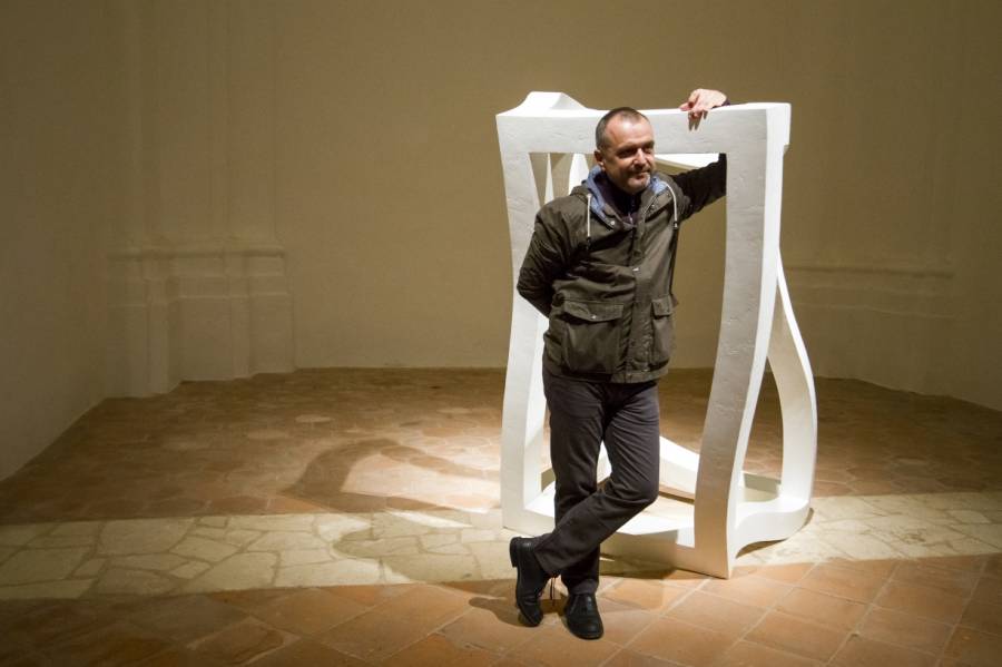 Alem Korkut ob otvoritvi razstave Telo/Corpus v nekdanji samostanski cerkvi, 2017, foto arhiv GBJ
