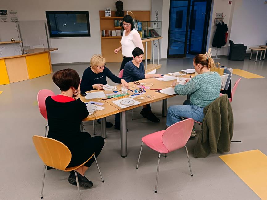 Delavnica, ki je potekala na strokovnem oddelku knjižnice, je dokazala, da ročna dela še vedno nosijo posebno moč – umirjajo, spodbujajo ustvarjalnost ter omogočajo pristno druženje. Vezenje, nekoč vsakdanja spretnost naših babic, danes v hitrem tempu življenja ponovno pridobiva veljavo kot način osebnega izražanja in sprostitve.