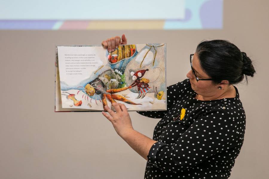 Pravljica z ustvarjalnico. Rdeča nit tokratnega druženja v Dvorani Savice Zorko je bilo recikliranje. Pomen ločevanja in trajnostnega delovanja s hrano smo spoznali ob poslušanju pravljice Eko lonec, avtorice Mojiceje Bonte. Kratkemu klepetu o ločevanju odpadkov je sledilo ustvarjanje papirja.