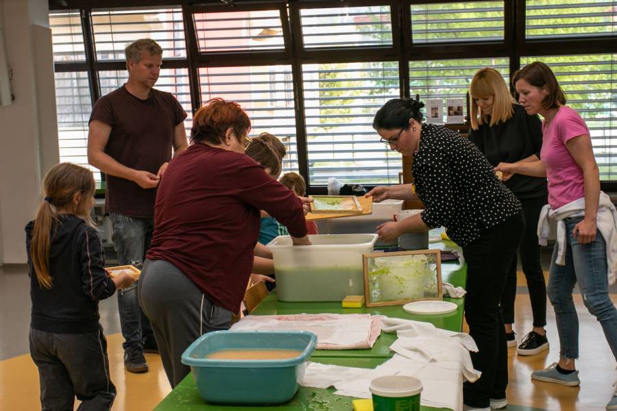 Med lovljenjem delčkov kaše s sitom so nekateri naredili premor in že pripravljene reciklirane liste zapolnili s posebnimi vsebinami in vzorci.