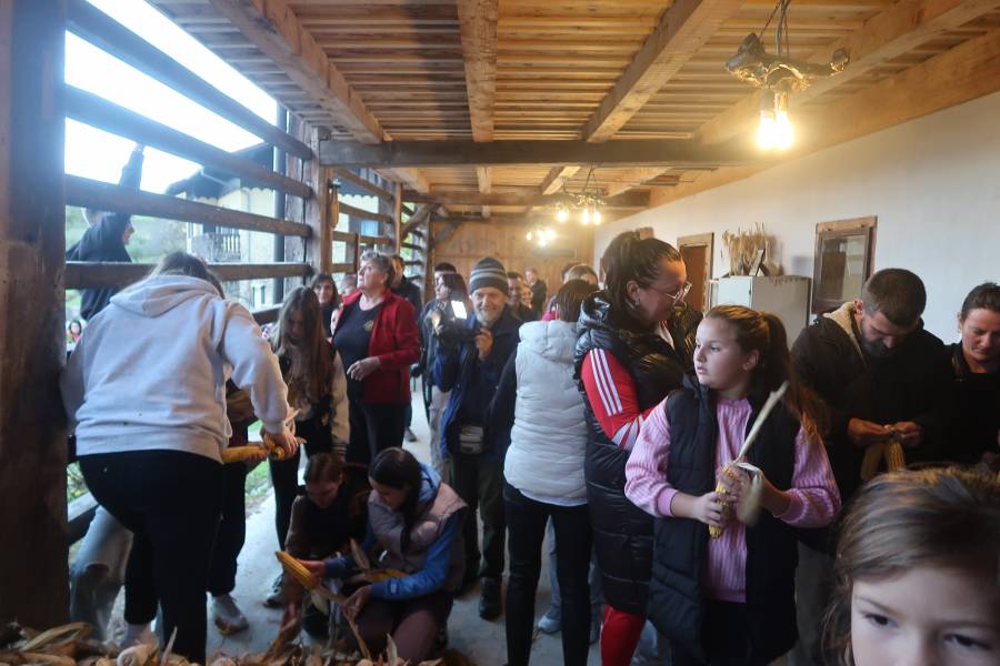 Po uvodnih navodilih Anice Butkovič in ravnateljice Nuške Ogorevc smo se lotili dela, kup koruze je bil kar velik. Ker smo sodelovali vsi, je bil »likof« po dveh urah, ko smo sedli k večerji, končan. Še prej pa nam je učitelj
