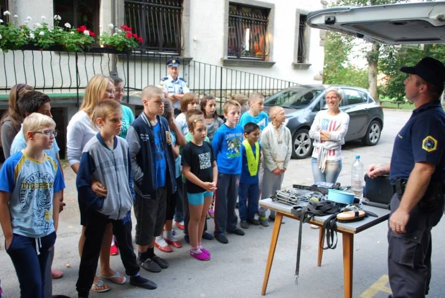 V sredo, 14. septembra, nas je zjutraj na šoli obiskal policist iz Policijske postaje Sevnica. Pogovarjali smo se o varni poti v šolo – obnovili smo dosedanje znanje naučili pa smo se tudi kaj novega. Po pogovoru nas je pred šolo čakal vodnik policijskih psov, g. Darko, ki nam je predstavil svoje delo s psi, njihovo opremo. S seboj je pripeljal dve psički, Mimi in Kalo. Najbolj smo bili veseli nad prikazom njune ubogljivosti.