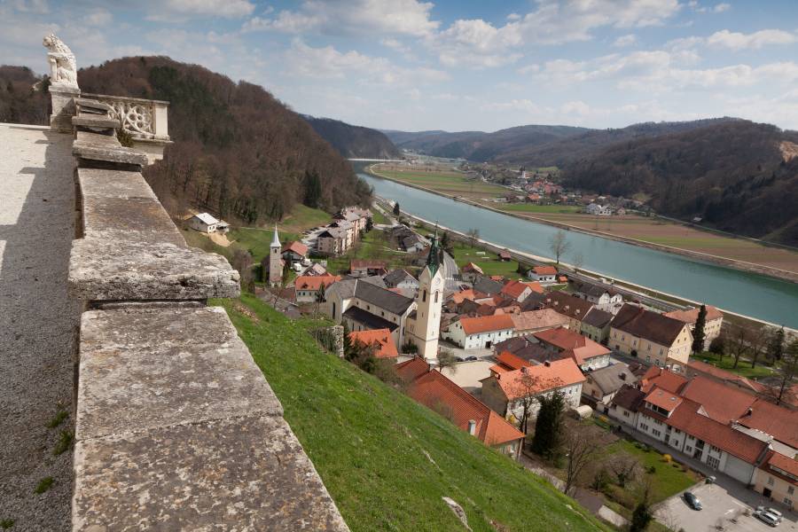 Pogled na sevniški grad in spodaj ležeče trško jedro (foto: Boštjan Colarič)