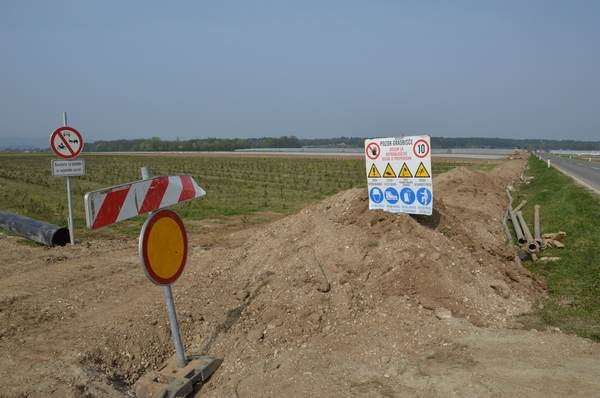 Že od leta 2006 južno od omenjene ceste deluje prva faza omenjenega namakalnega sistema, po več letih pridobivanja potrebnih soglasij pa je Občina Krško decembra lani podpisala pogodbo z izbranim izvajalcem del, podjetjem Gradnje Boštanj. Dela so se zaradi neugodnih vremenskih razmer začela kasneje, kot je bilo načrtovano, izvajalec je imel na določenih odsekih težave tudi zaradi vdora podtalnice, gradnjo pa spremljajo tudi arheologi, ki so sicer naleteli na določene najdbe, a potekal del ne ovirajo. Dela naj bi se sicer končala do 30. aprila, vendar pa bo potrebno dela zaradi omenjenih razlogov podaljšati za približno 45 dni.