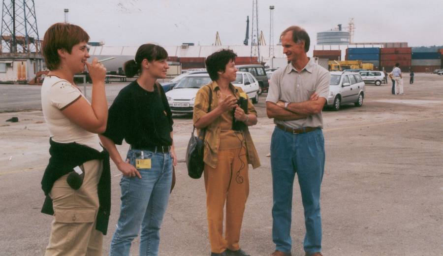 Prevoz smo od starta do cilja spremljali tudi mediji; v pogovoru z direktorjem NEK Stanislavom Rožmanom v Kopru novinarke (z leve) Tamara Vonta (POP TV), Bojana Mavsar (Posavski obzornik) in Irena Majce (Radio Slovenija).