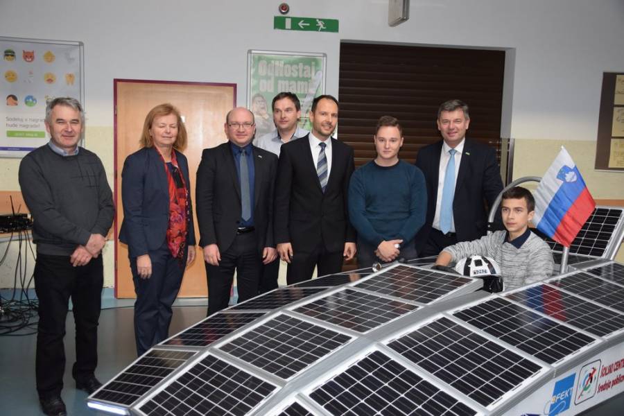 Gašperšič in Boh z vodstvom šole in sodelujočimi v projektu solarnega avtomobila