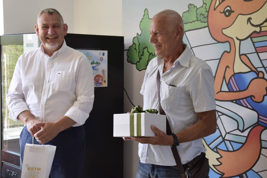 Župan Srečko Ocvirk je Borutu Bizjaku, vodji bazena z najdaljšim stažem, izročil spominsko darilo.
