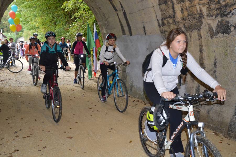 Vlado Bezjak in osnovnošolca krške šole predali v uporabo novo kolesarsko povezavo, ki je speljana skozi predor nekdanje ozkotirne železniške proge.