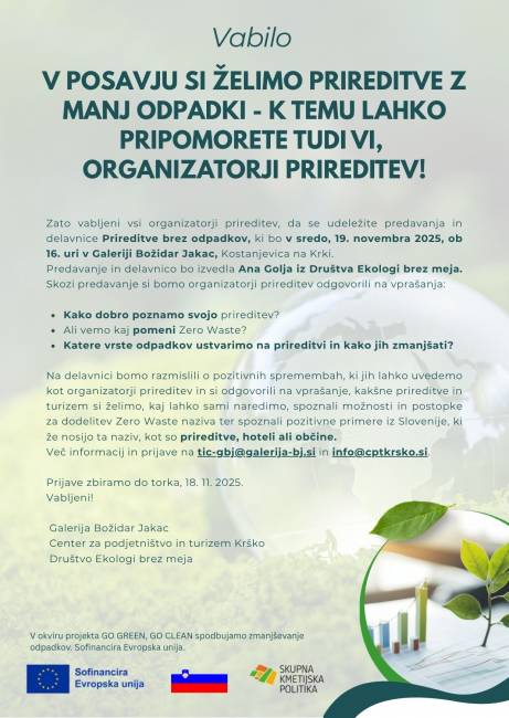 izobraževanje za organizatorje prireditev z naslovom Prireditve brez odpadkov, ki bo v sredo, 19. 11., ob 16. uri v Galeriji Božidar Jakac. Predavanje in delavnico bo izvedla