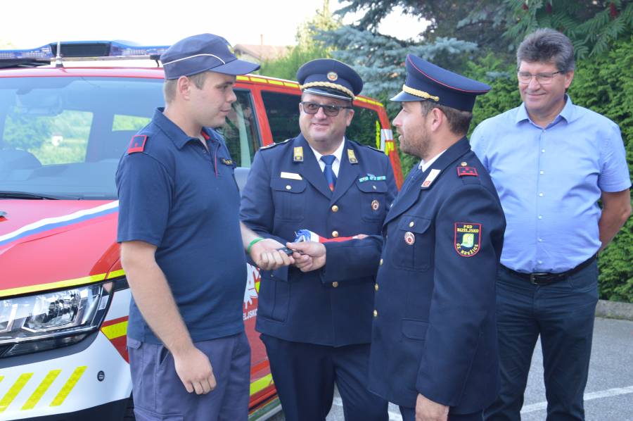 Namestnik poveljnika PGD Bizeljsko Evgen Per predaja ključe glavnemu strojniku Kristjanu Vahčiču.