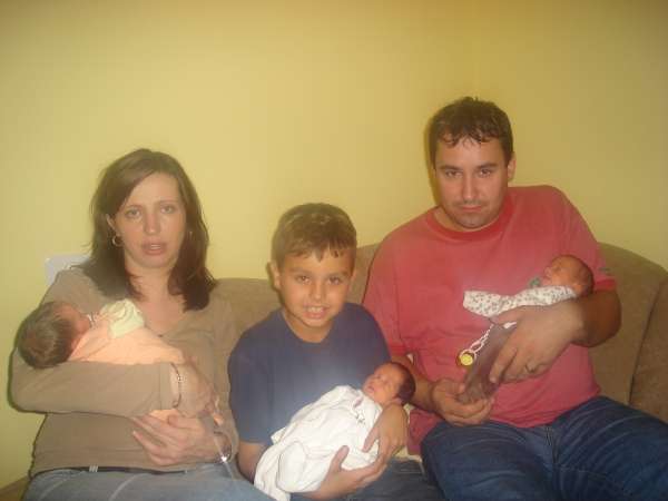 Pred letom dni je najprej na svet prijokala Stela, težka 1615 g in velika 41 cm, z minutnimi zamudami Dolores, težka 1605 g in velika 42 cm ter Sara, težka 1420 g in velika 40 cm. Trojčice so takoj zelo lepo napredovale in presenetljivo hitro vrnile k očku in bratcu Aljoši. Ati Bojan je ponosen na sina Aljošo, ki jih ima neverjetno rad, a to smo opazili že takrat, ko so sestrice prespale doma komaj prvo noč in je tudi Aljoša takrat dežural, če spijo in če je z njimi vse v redu.