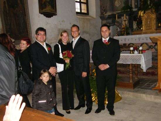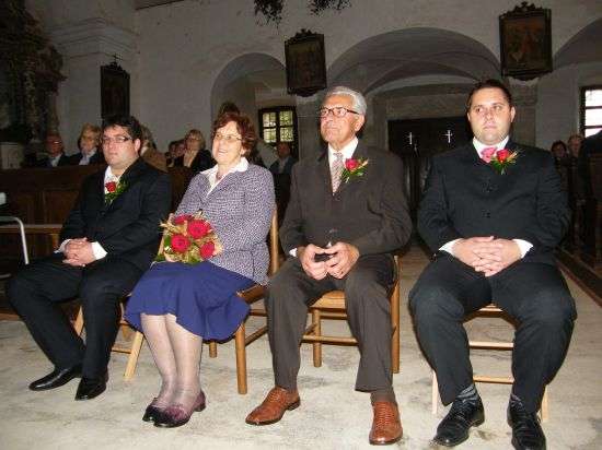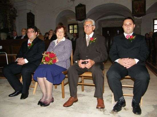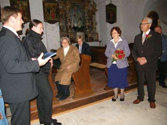Ob svečani zlatoporočni slovesnosti, ki so jo opravili v cerkvici sv. Jožefa na Trški Gori, je maševal raški župnik Franci Levičar, ki ima družinske korenine prav v kraju slovesnega obreda. Dobro razpoložena se je hčerkine zlate poroke udeležila tudi še zelo čila mati Milka Šonc.