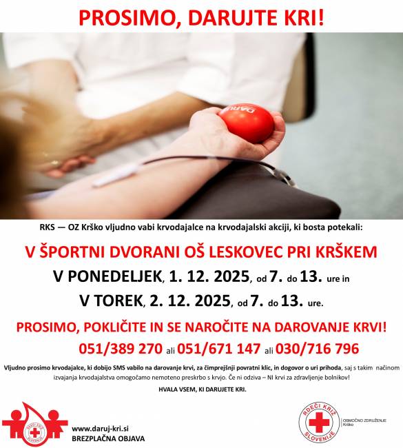Območno združenje Rdečega križa Krško v prvih decembrskih dneh organizira zimski krvodajalski akciji
