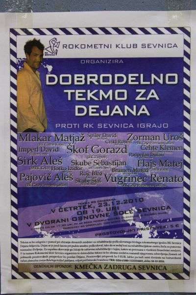 Rokometni klub Sevnica je včeraj v športni dvorani pri OŠ Sava Kladnika Sevnica organiziral dobrodelno rokometno tekmo za pomoč pri zbiranju denarnih sredstev za rehabilitacijo poškodovanega bivšega rokometnega igralca RK Sevnica Dejana Mijovića, ki je po nesreči v letošnjem poletju postal tetraplegik.
