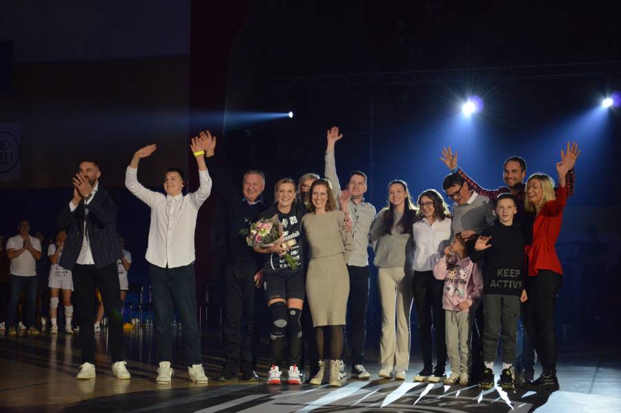 ter njeni domači, ki so ji pripravili lepo presenečenje med enim od odmorov tekme, za mikrofon je prijela njena starejša sestra ter izrazila ponos, da imajo v družini tako odlično in uspešno športnico, ob njej sta bila tudi njen mož